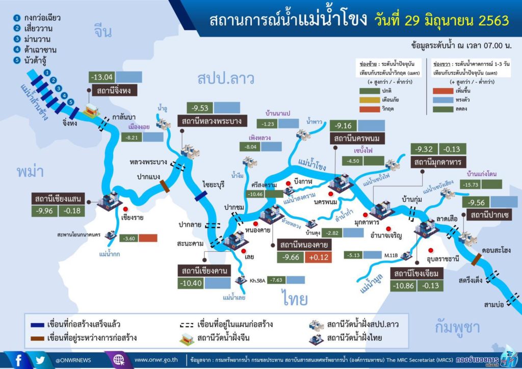 สำหรับ ภาพรวมสถานการณ์แม่น้ำโขงวันนี้ (29 มิถุนายน 2563) ปริมาณน้ำในแม่น้ำโขงยังคงมีปริมาณน้ำน้อยถึงน้อยวิกฤติ และมีแนวโน้มทรงตัว โดยที่สถานีจิ่งหง สาธารณรัฐประชาชนจีน ระดับน้ำปัจจุบันยังต่ำกว่าระดับน้ำวิกฤติอยู่ที่ 13.04 เมตร ที่สถานีเชียงแสน จังหวัดเชียงราย ระดับน้ำปัจจุบันยังต่ำกว่าระดับน้ำวิกฤติอยู่ที่ 9.96 เมตร ที่สถานีหลวงพระบาง สาธารณรัฐประชาธิปไตยประชาชนลาว (สปป.ลาว) ระดับน้ำปัจจุบันยังต่ำกว่าระดับน้ำวิกฤติอยู่ที่ 9.53 เมตร ที่สถานีโขงเจียม จังหวัดอุบลราชธานี ระดับน้ำปัจจุบันยังต่ำกว่าระดับน้ำวิกฤติอยู่ที่ 10.86 เมตร ส่วนที่สถานีปากเซ สปป.ลาว ระดับน้ำปัจจุบันยังต่ำกว่าระดับน้ำวิกฤติอยู่ที่ 9.56 เมตร ทั้งนี้ กองอำนวยการน้ำแห่งชาติ (กอนช.) จะยังคงติดตามสถานการณ์น้ำในสาธารณรัฐประชาชนจีน และจะประสานงานกับหน่วยงานที่เกี่ยวข้องเพื่อประเมินสถานการณ์อย่างต่อเนื่องต่อไป