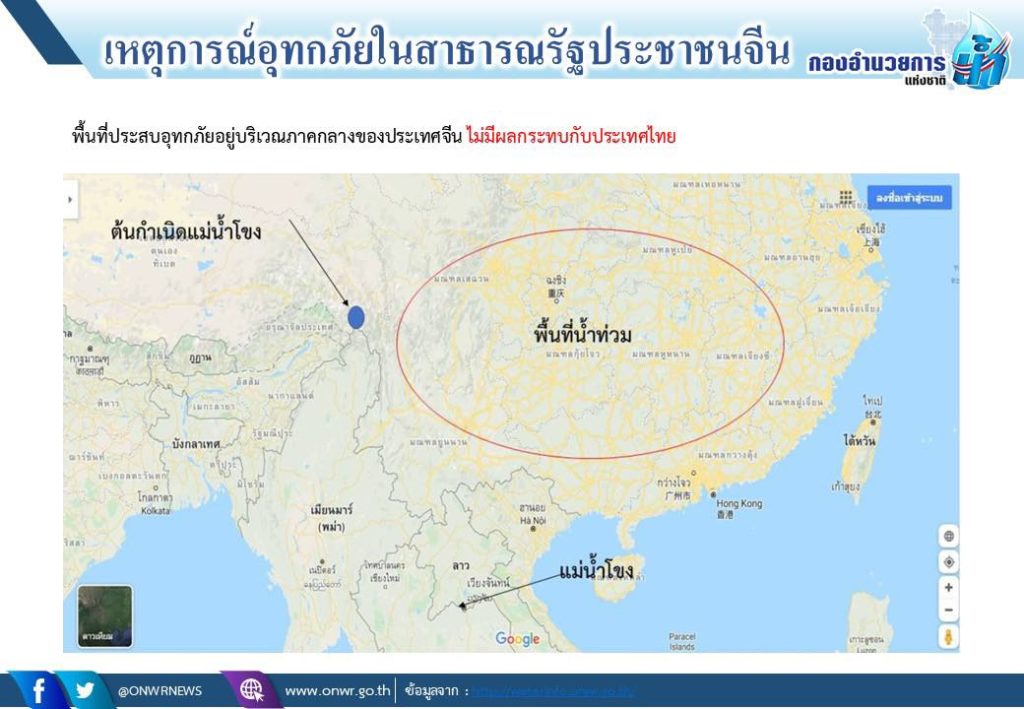 กองอำนวยการน้ำแห่งชาติ (กอนช.) เผยจากสถานการณ์ฝนที่ตกหนักในประเทศจีนทำให้เกิดน้ำท่วมสูง อ่างเก็บน้ำหลายแห่งต้องเร่งระบาย กระทบหลายมณฑล แต่เป็นพื้นที่ที่ไม่ได้อยู่บริเวณต้นน้ำของแม่น้ำโขง ทำให้ไม่ส่งผลต่อระดับน้ำในแม่น้ำโขง และไม่ส่งผลกระทบต่อประเทศไทย เนื่องจากเป็นลำน้ำคนละสาย และไม่มีการระบายน้ำเพิ่มจากจีน